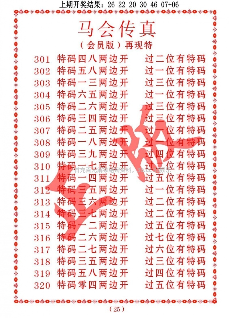 | 303-305期〖必开单双八码〗开:1期 【单:13.21.25.35.37.41.27.31】 【双:06.18.22.26.36.40.42.46】 |